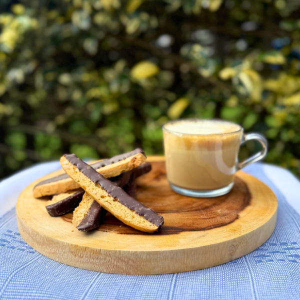 For a luxurious and rich pairing, you can't go wrong with our Macadamia Biscotti and a freshly brewed, aromatic coffee. This traditional orange and macadamia biscotti is dipped in rich dark chocolate. The coffee's deep, slightly bitter notes perfectly complement the crunch of the biscotti, the subtle citrus flavour of the orange, and the creaminess of the macadamia nuts. This pairing is a harmonious blend of textures and tastes, creating a moment of sophisticated indulgence.